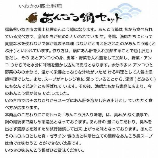 本商品のこだわりにこだわった「あんこう肝入り味噌」は、臭みがなく濃厚で、鍋の最後まで楽しめる逸品となっております。あん肝の量にもこだわり、臭みを出さず濃厚さを残すため試行錯誤して出来上がった味となっております。あんこうのホロホロとした身・ゼラチン質の皮と味噌仕立ての濃厚なあんこう鍋スープは他では味わうことができない逸品です。